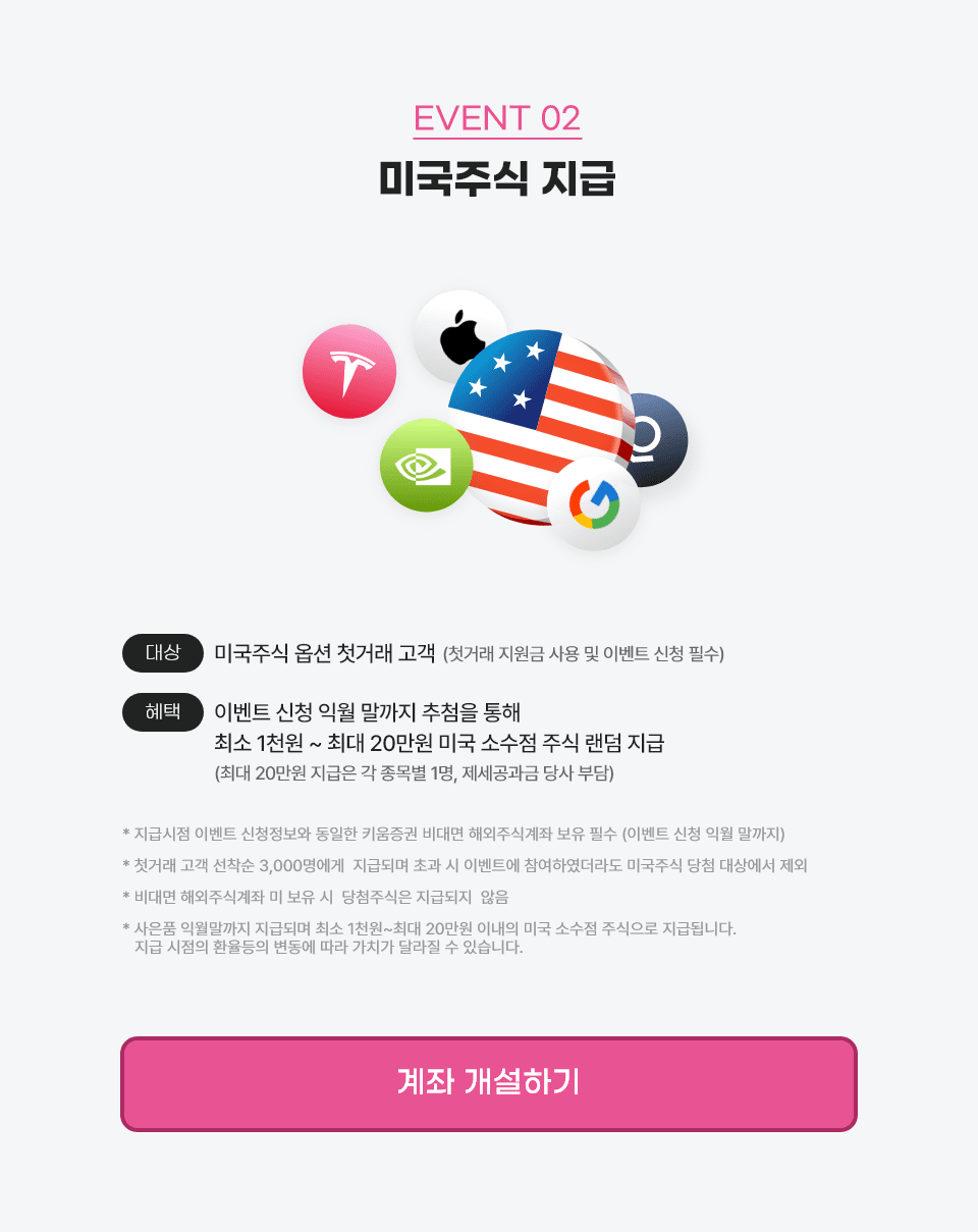 * 첫거래 고객 선착순 3,000명에게 지급되며 초과 시 이벤트에 참여하였더라도 미국주식 당첨 대상에서 제외