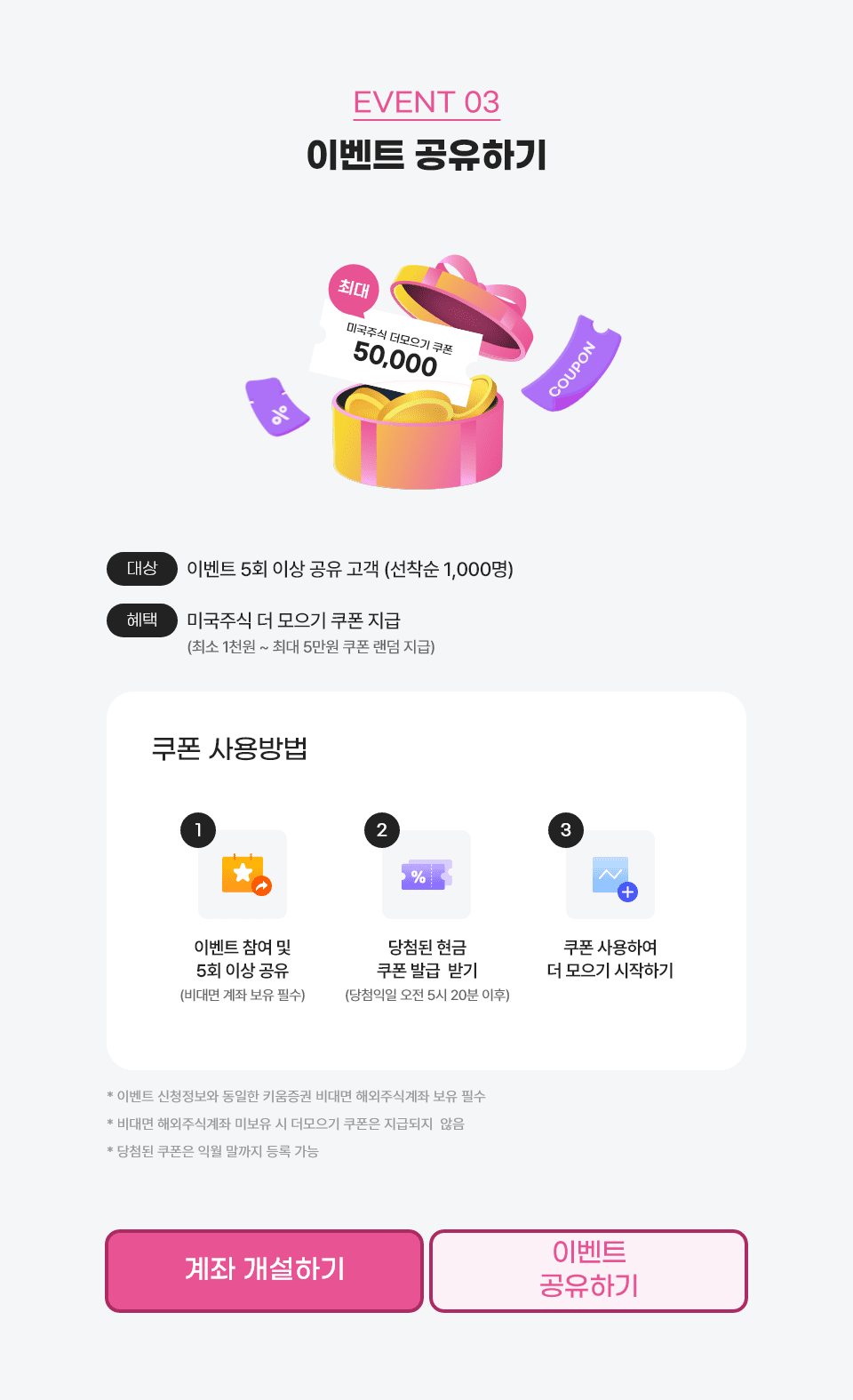 혜택: 미국주식 더 모으기 쿠폰 지급(최소 1천원 ~ 최대 5만원 쿠폰 랜덤 지급)