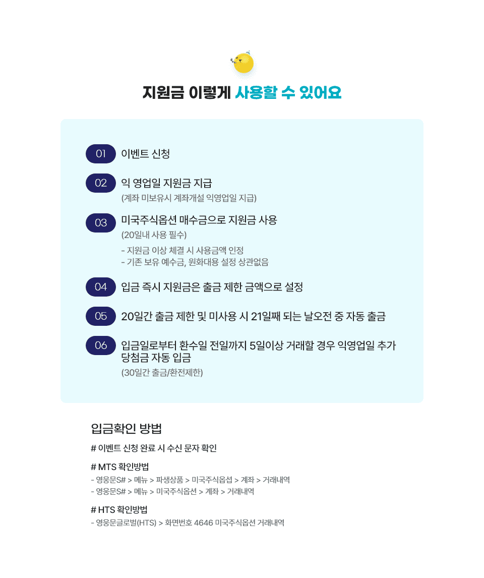 지원금 입금 후 환수일 전까지 미국주식옵션 5일 거래 시 익영업일 추가 당청금이 입금되며 해당 금액은 30일간 인출 및 환전이 제한됩니다.