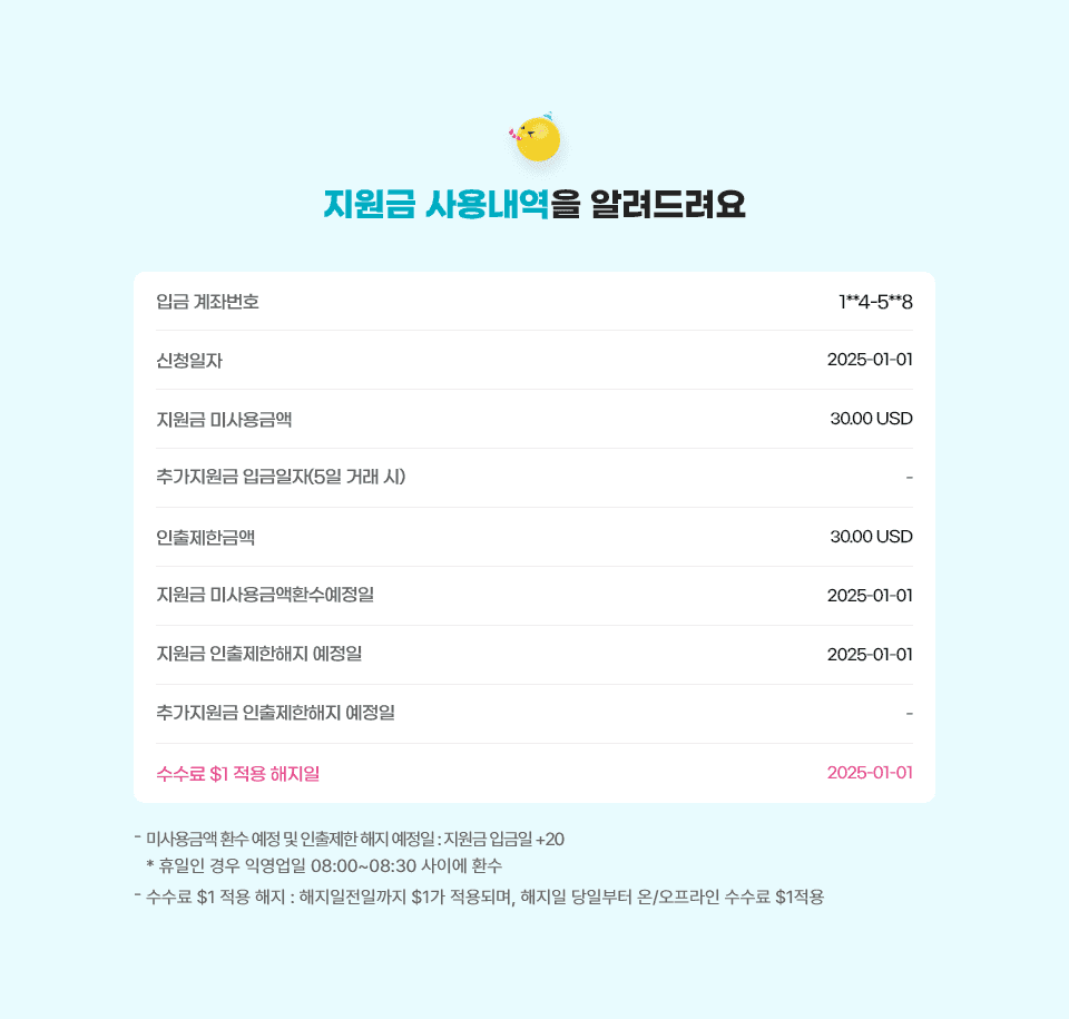 - 2025년 10월 22일(수) 오전 미사용금액 $5 자동환수 및 인출제한 해지