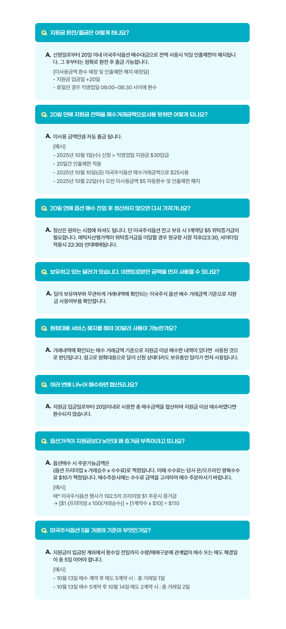 A. 달러 보유여부와 무관하게 거래내역에 확인되는 미국주식 옵션 매수 거래금액 기준으로 지원금 사용여부를 확인합니다.