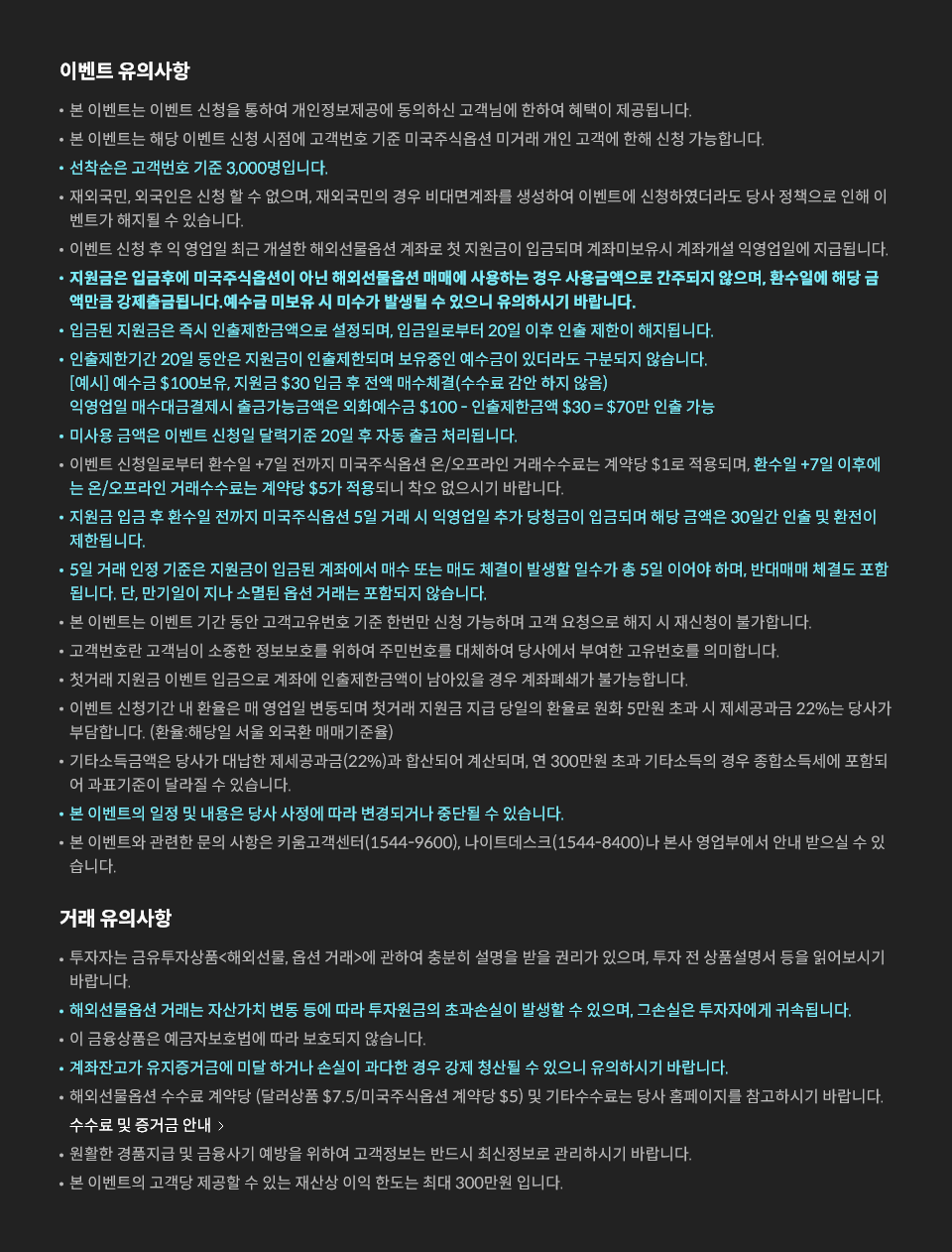 - 첫거래 지원금 입금 후 미국주식옵션이 아닌 타상품(해외선물 옵션) 매매에 사용한 경우 환수일 이후 해당 금액만큼 외화 예수금을 보유하지 않을 시 미수 발생 가능