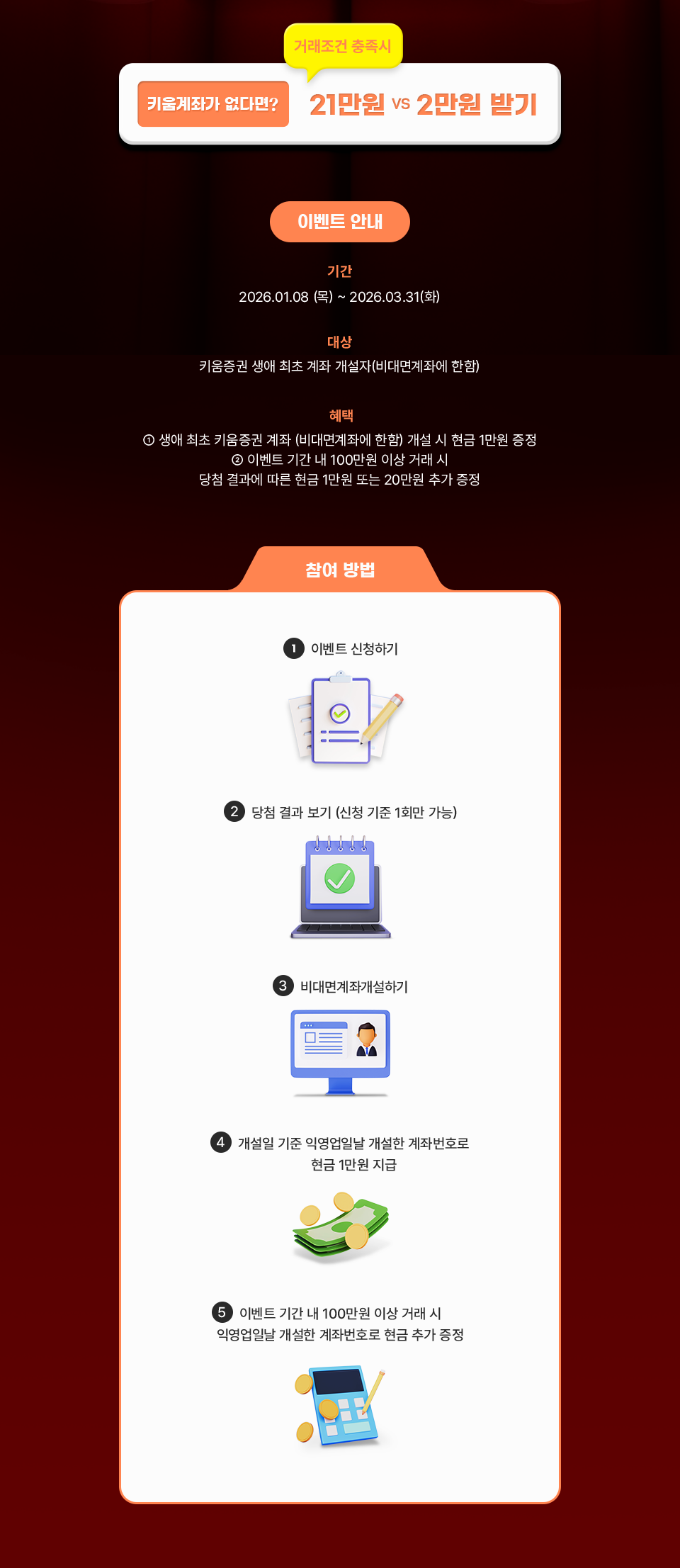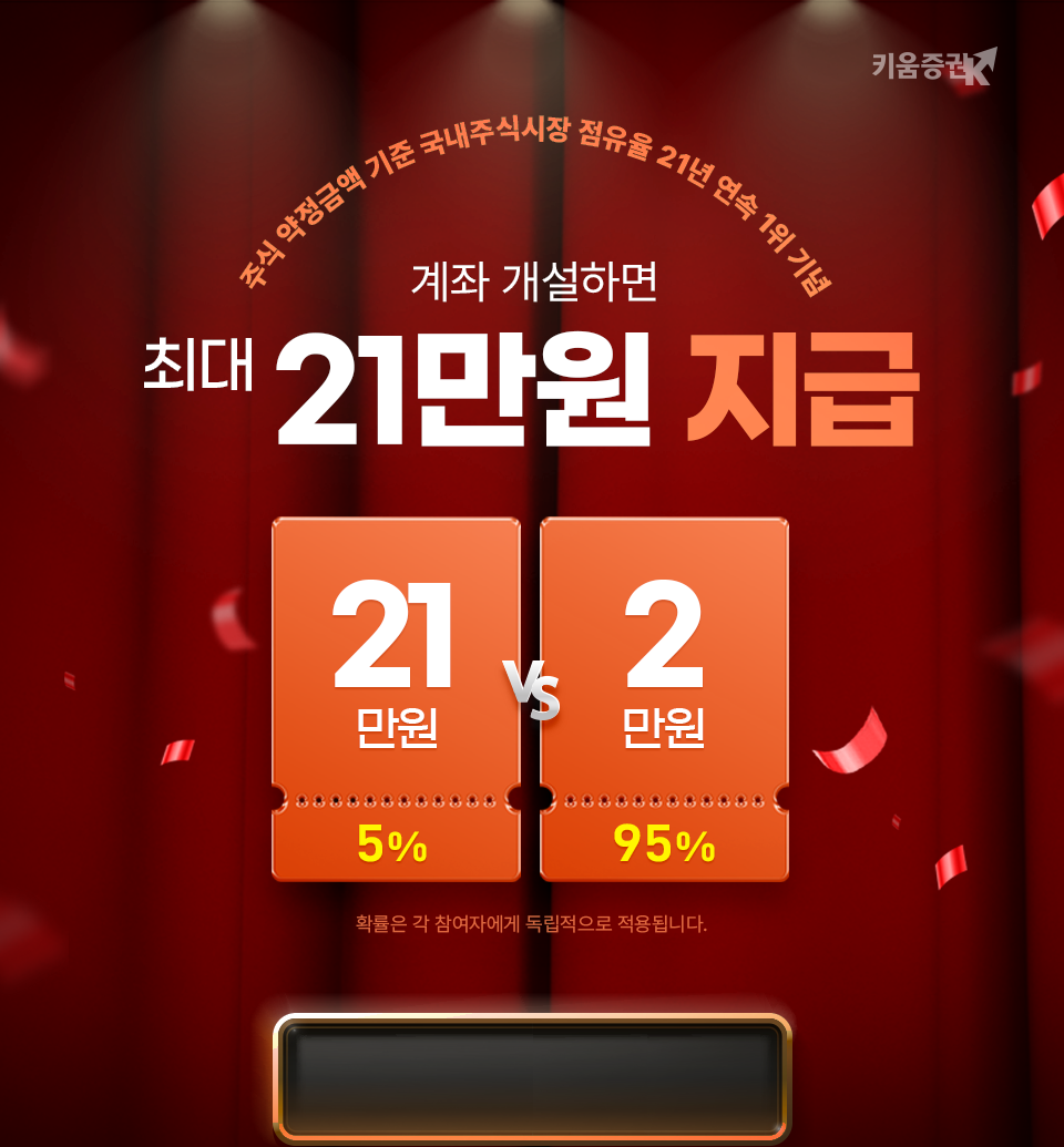● 이벤트 기간 내 생애 최초 키움증권 계좌개설(비대면계좌에 한함) 및 국내주식 100만원 이상 거래 시 현금 1만원 또는 현금