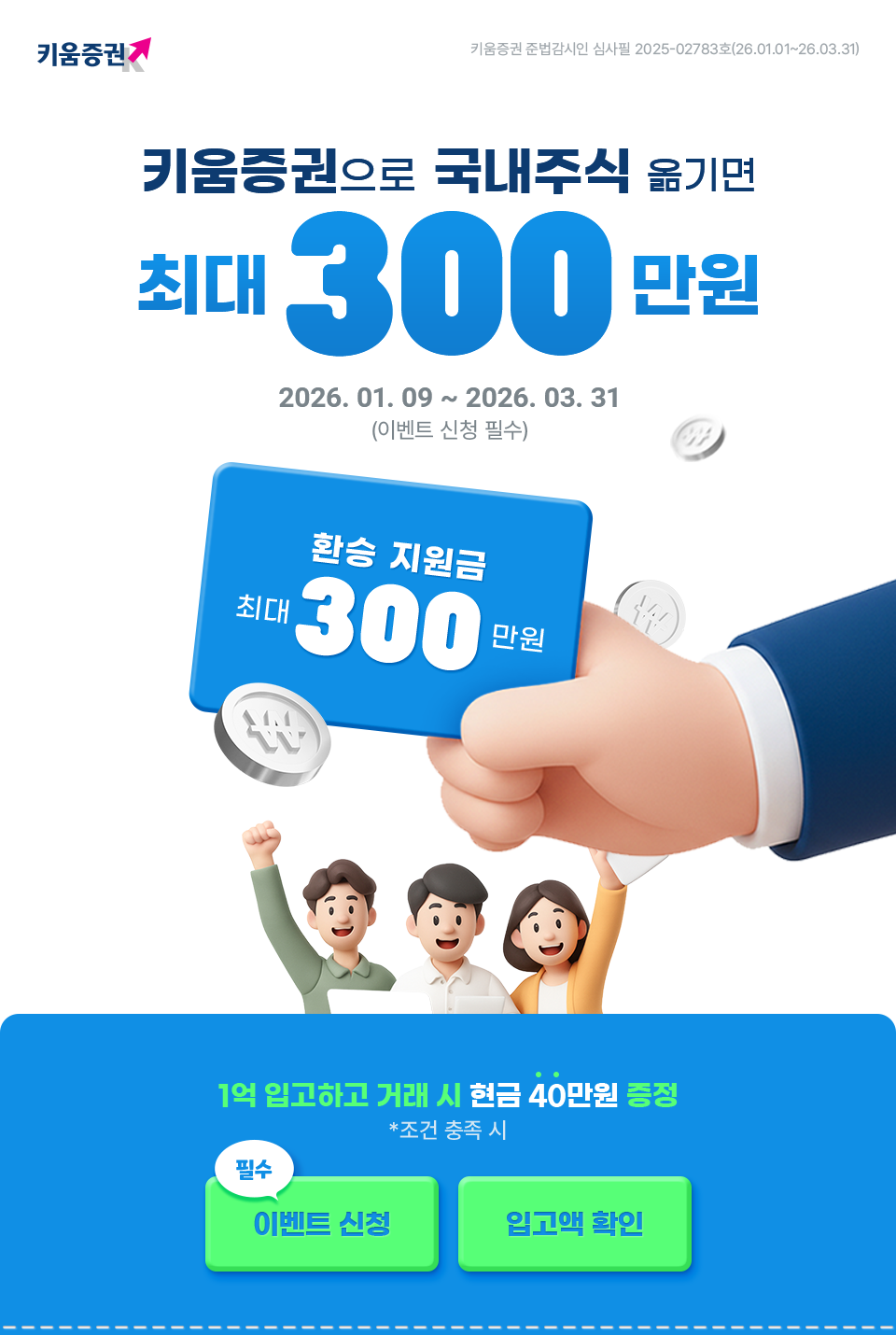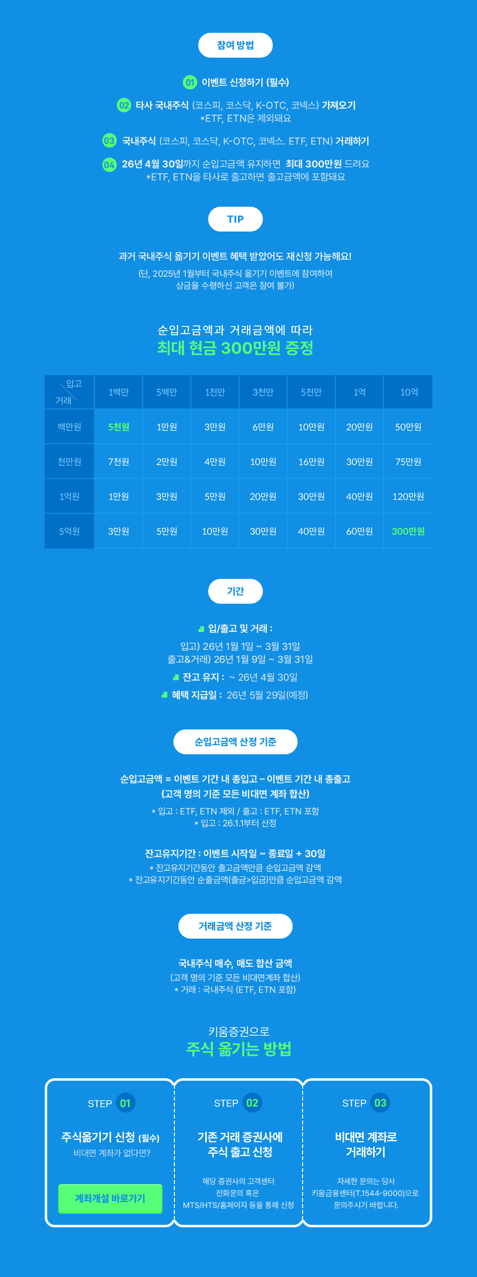 26년 4월 30일까지 순입고금액 유지하면 최대 300만원 드려요*ETF, ETN을 타사로 출고하면 출고금액에 포함돼요
