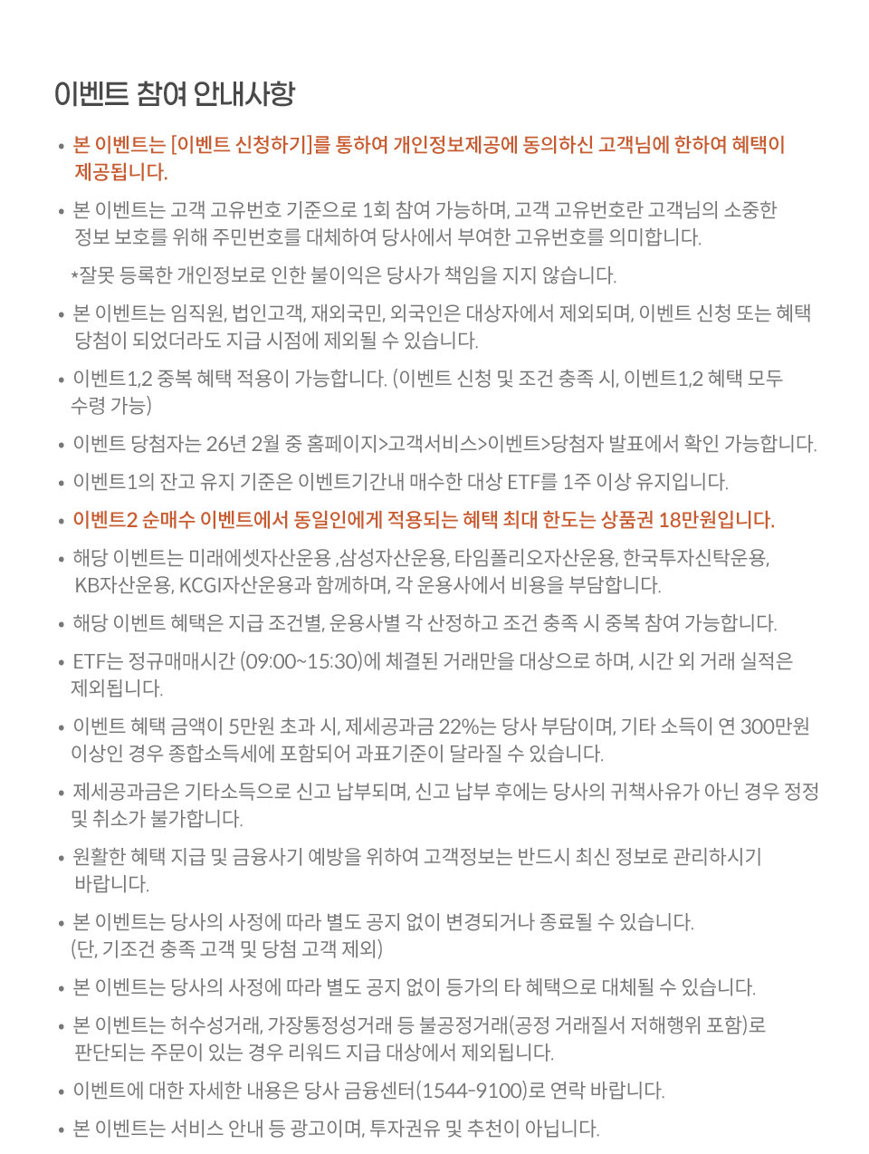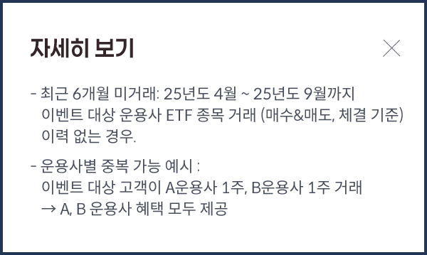 • 이벤트1의 잔고 유지 기준은 이벤트기간내 매수한 대상 ETF를 1주 이상 유지입니다.