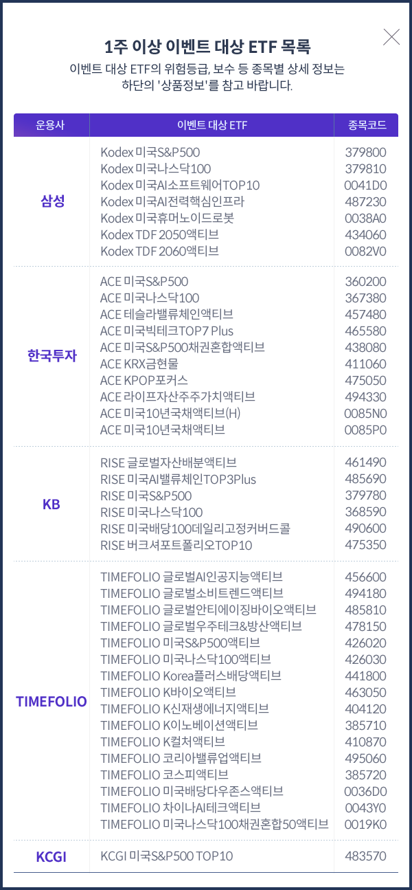 | 운용사 | 순매수 조건 및 혜택 | 이벤트 대상 ETF | |||||||